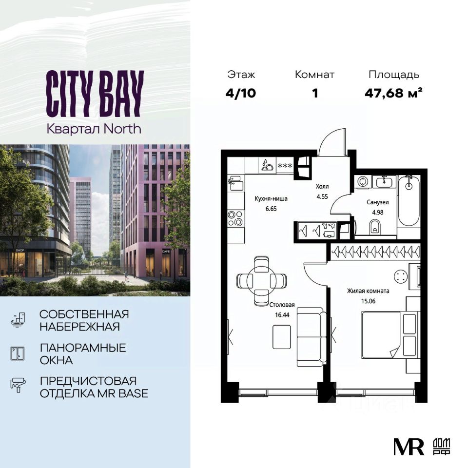 Продаётся 1-к квартира общей площадью 47.68 м² с предчистовой отделкой в ЖК City Вау, квартале North, на 4-м этаже 10 этажного дома.