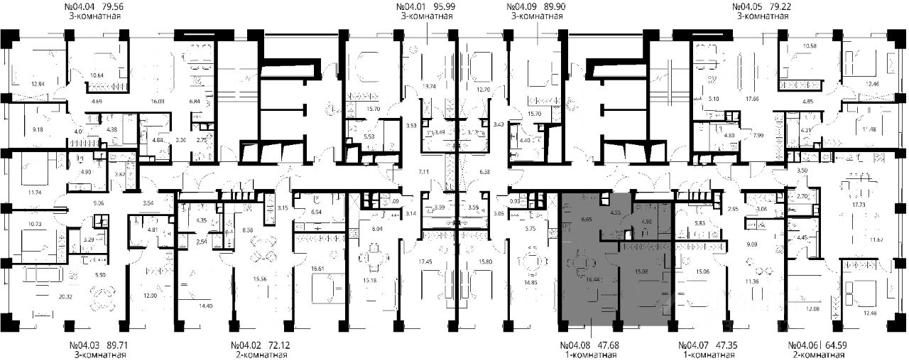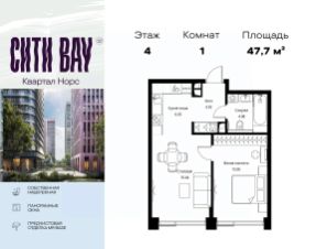 Продаётся 1-комнатная квартира общей площадью 47.68 м² с предчистовой отделкой в ЖК Сити Бэй, квартале Норс, на 4-м этаже 10 этажного дома.