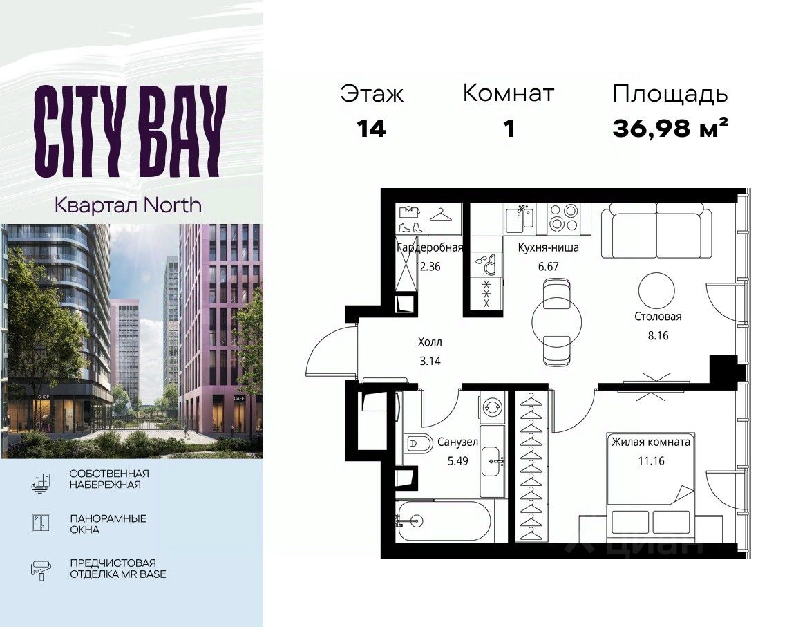 Продаётся 1-комнатная квартира общей площадью 36.98 м² с предчистовой отделкой в ЖК City Вау, квартале North, на 14-м этаже 49 этажного дома.