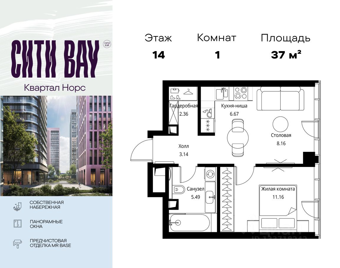 Продаётся 1-комнатная квартира общей площадью 36.98 м² с предчистовой отделкой в ЖК Сити Бэй, квартале Норс, на 14-м этаже 49 этажного дома.