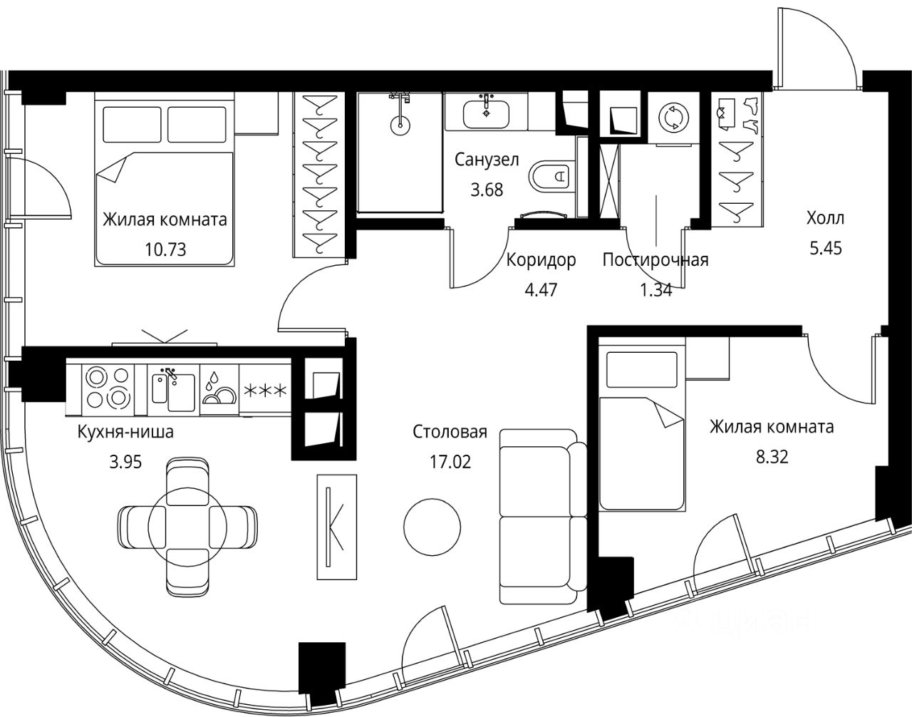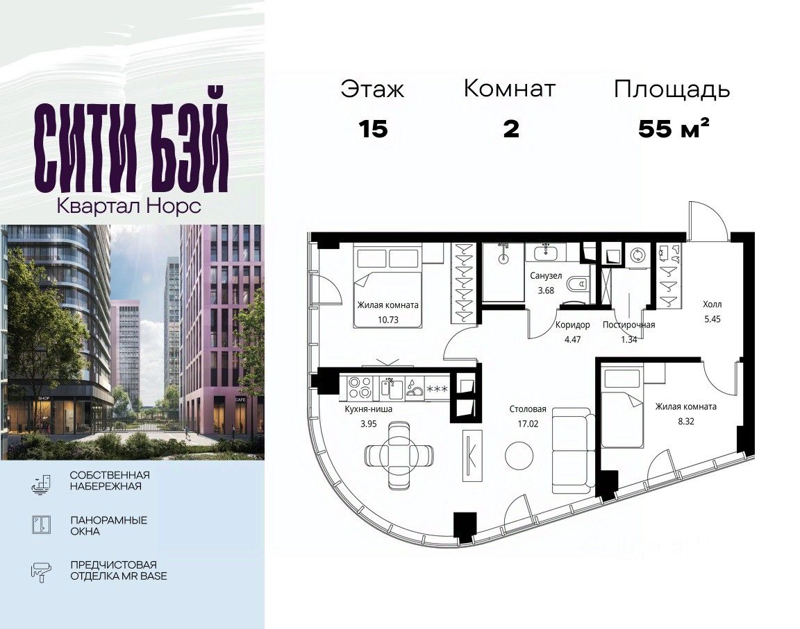 Продаётся 2-комнатная квартира общей площадью 54.96 м² с предчистовой отделкой в ЖК Сити Бэй, квартале Норс, на 15-м этаже 49 этажного дома.