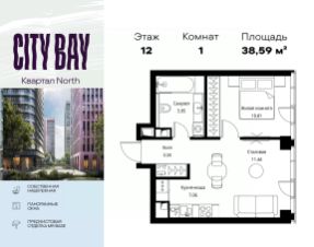 Продаётся 1-комнатная квартира общей площадью 38.59 м² с предчистовой отделкой в ЖК City Вау, квартале North, на 12-м этаже 49 этажного дома.