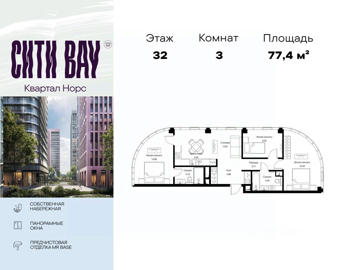 Продаётся 3-комнатная квартира общей площадью 77.37 м² с предчистовой отделкой в ЖК Сити Бэй, квартале Норс, на 32-м этаже 49 этажного дома.