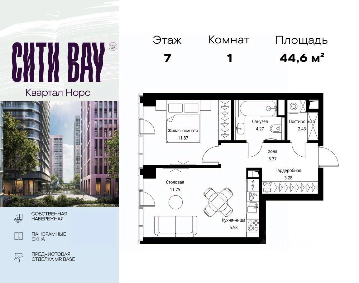 Продаётся 1-комнатная квартира общей площадью 44.55 м² с предчистовой отделкой в ЖК Сити Бэй, квартале Норс, на 7-м этаже 49 этажного дома.