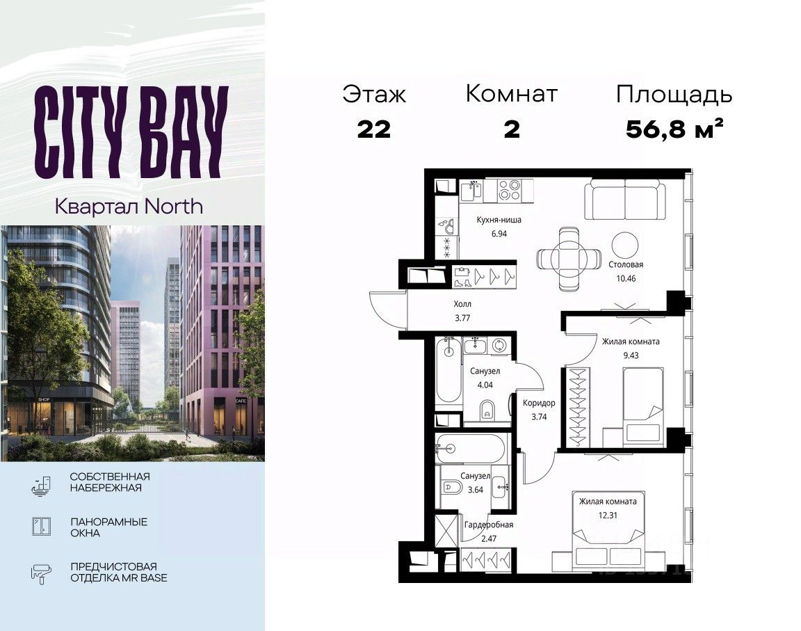 Продаётся 2-комнатная квартира общей площадью 56.80 м² с предчистовой отделкой в ЖК City Вау, квартале North, на 22-м этаже 49 этажного дома.