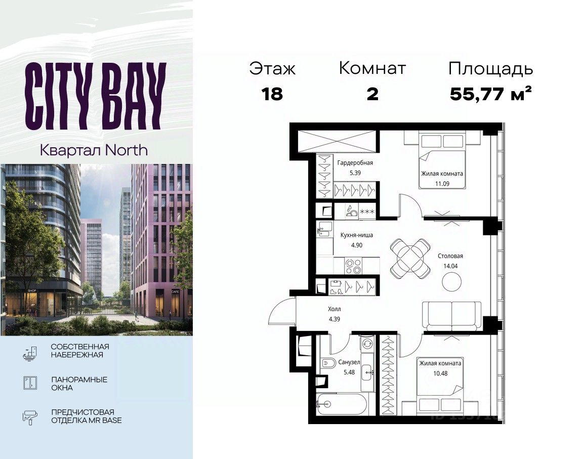 Продаётся 2-комнатная квартира общей площадью 55.77 м² с предчистовой отделкой в ЖК City Вау, квартале North, на 18-м этаже 49 этажного дома.