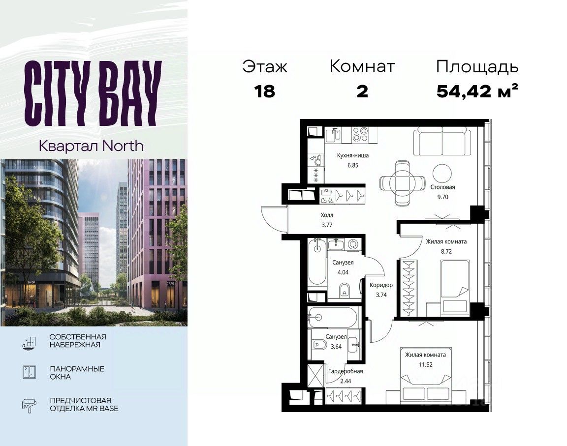 Продаётся 2-комнатная квартира общей площадью 54.42 м² с предчистовой отделкой в ЖК City Вау, квартале North, на 18-м этаже 49 этажного дома.
