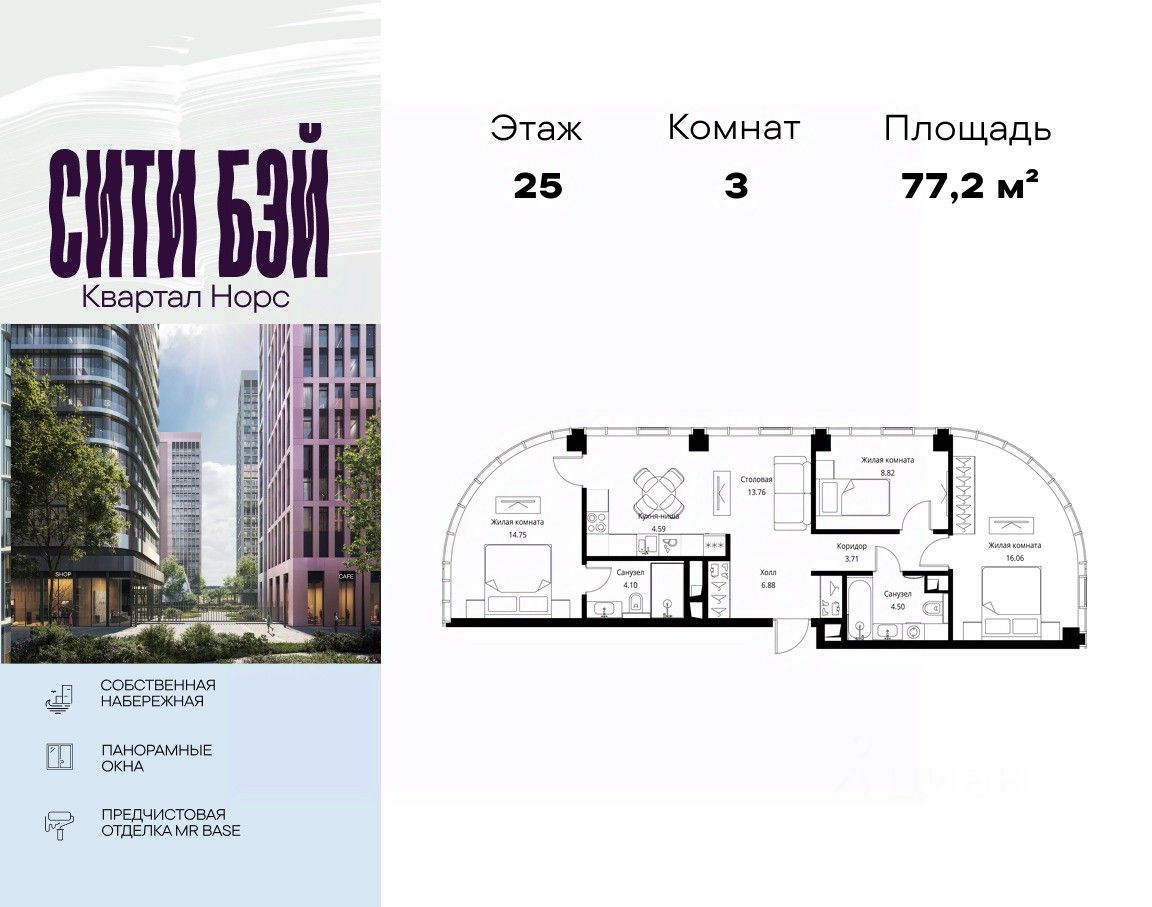 Продаётся 3-комнатная квартира общей площадью 77.16 м² с предчистовой отделкой в ЖК Сити Бэй, квартале Норс, на 25-м этаже 49 этажного дома.