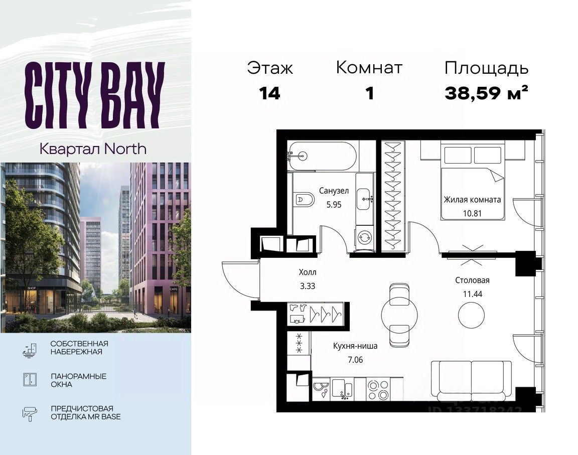 Продаётся 1-комнатная квартира общей площадью 38.59 м² с предчистовой отделкой в ЖК City Вау, квартале North, на 14-м этаже 49 этажного дома.