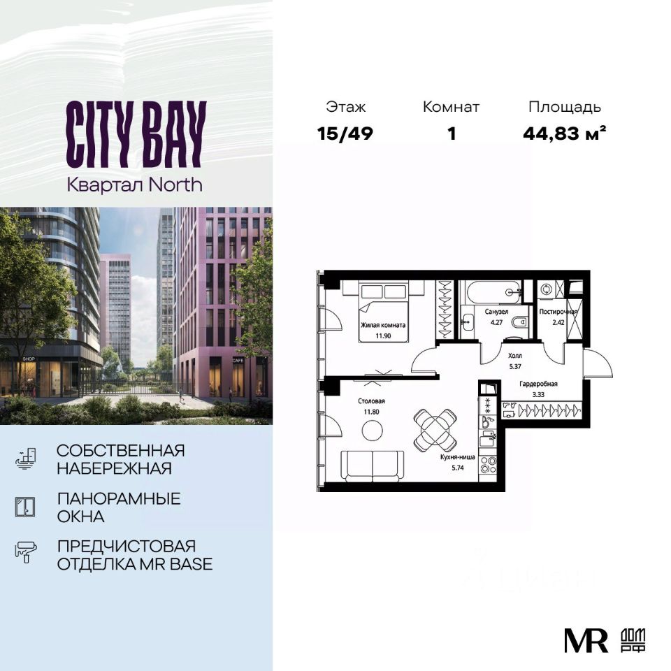 Продаётся 1-к квартира общей площадью 44.83 м² с предчистовой отделкой в ЖК City Вау, квартале North, на 15-м этаже 49 этажного дома.