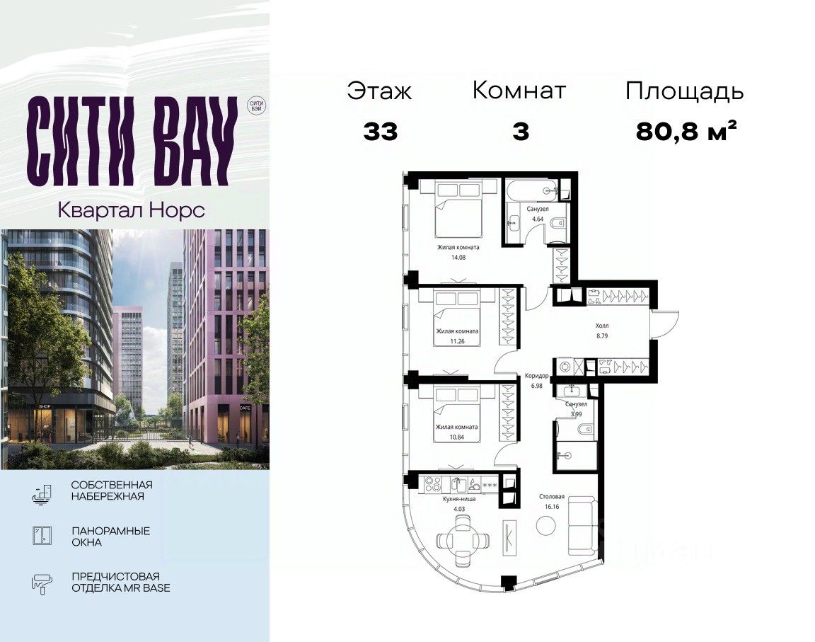 Продаётся 3-комнатная квартира общей площадью 80.77 м² с предчистовой отделкой в ЖК Сити Бэй, квартале Норс, на 33-м этаже 49 этажного дома.