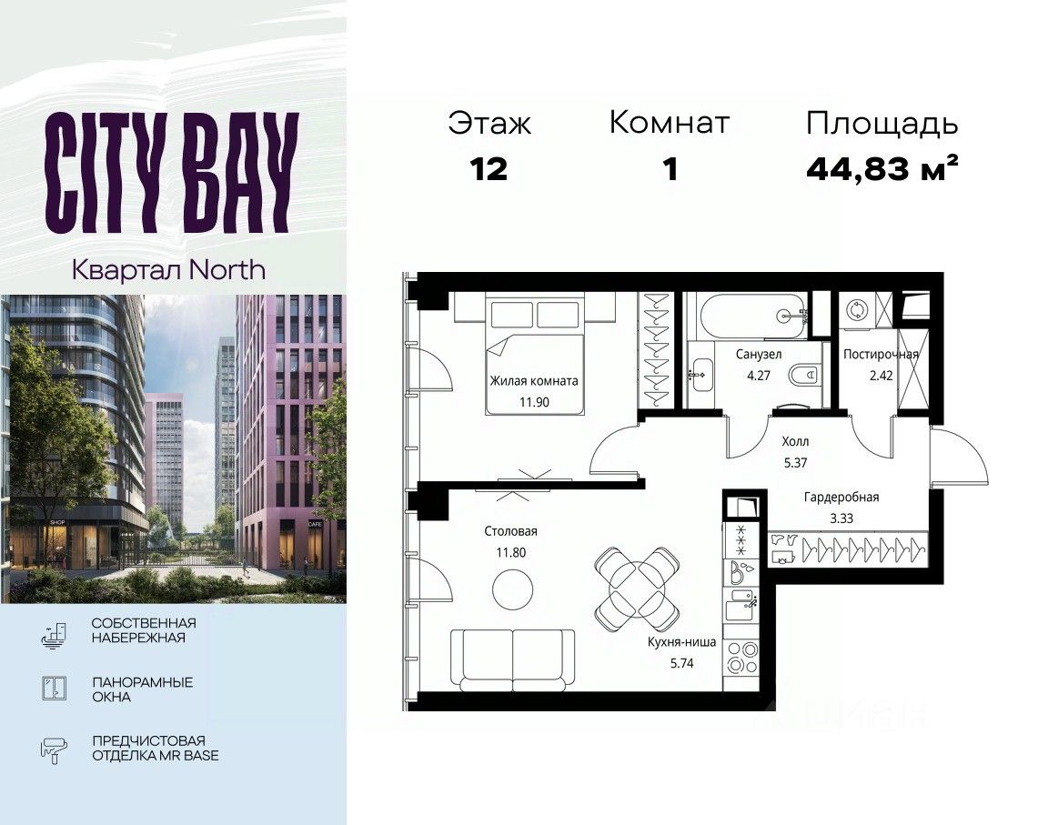 Продаётся 1-комнатная квартира общей площадью 44.83 м² с предчистовой отделкой в ЖК City Вау, квартале North, на 12-м этаже 49 этажного дома.