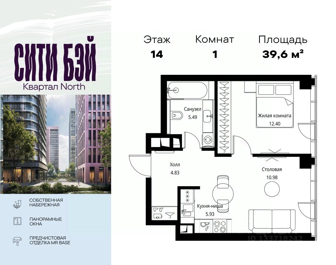 Продаётся 1-комнатная квартира общей площадью 39.63 м² с предчистовой отделкой в ЖК Сити Бэй, квартале Норс, на 14-м этаже 49 этажного дома.