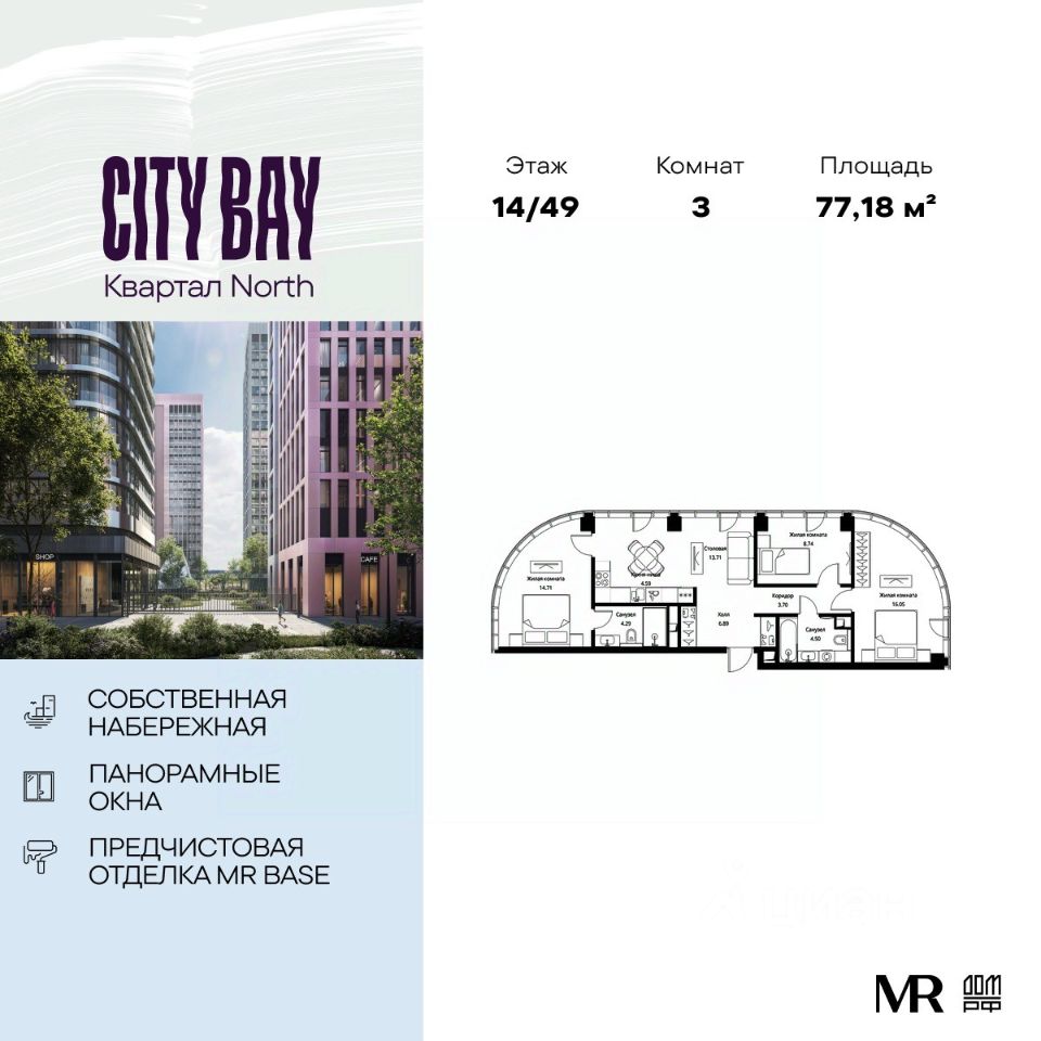 Продаётся 3-к квартира общей площадью 77.18 м² с предчистовой отделкой в ЖК City Вау, квартале North, на 14-м этаже 49 этажного дома.
