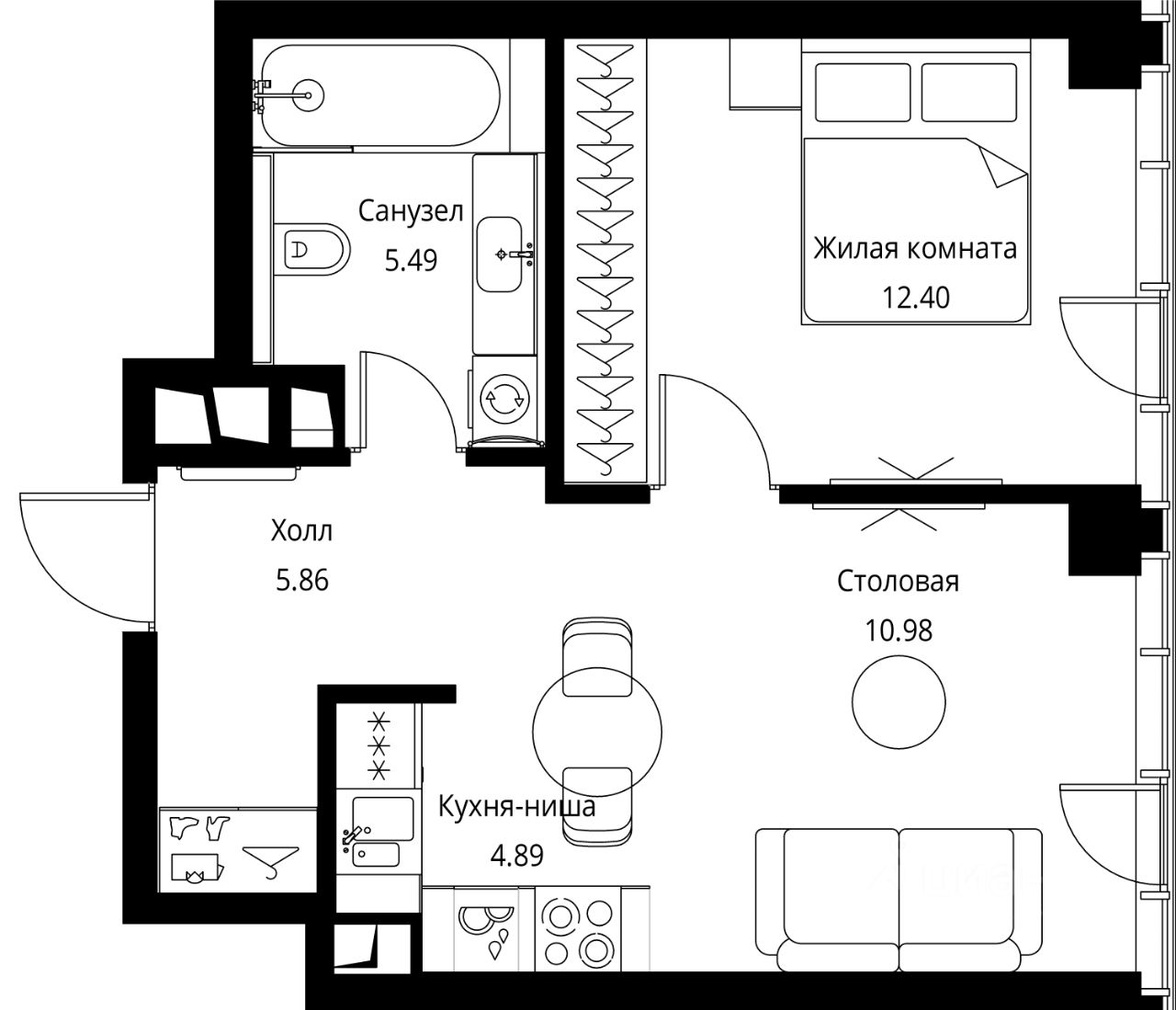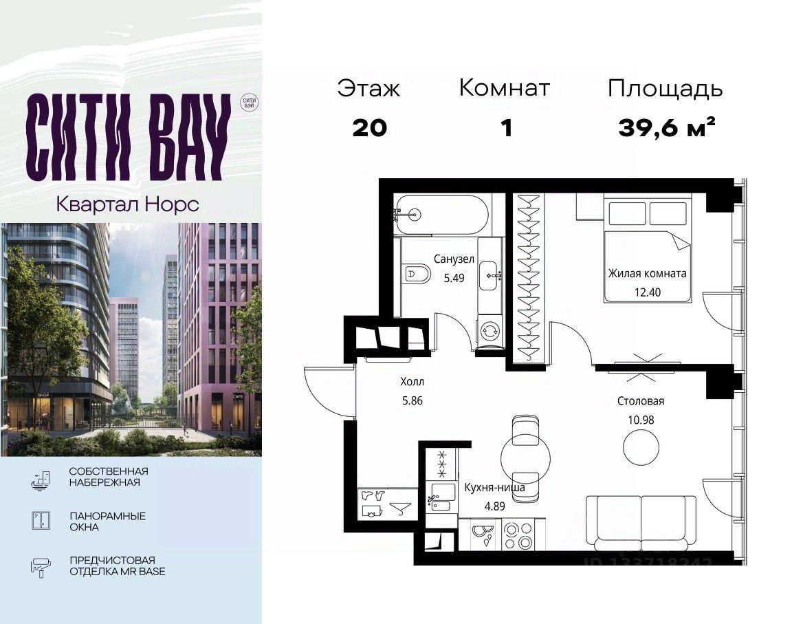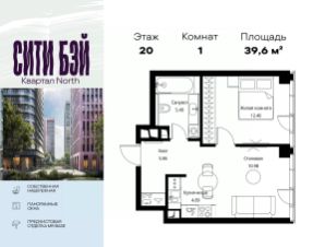 Продаётся 1-комнатная квартира общей площадью 39.62 м² с предчистовой отделкой в ЖК Сити Бэй, квартале Норс, на 20-м этаже 49 этажного дома.