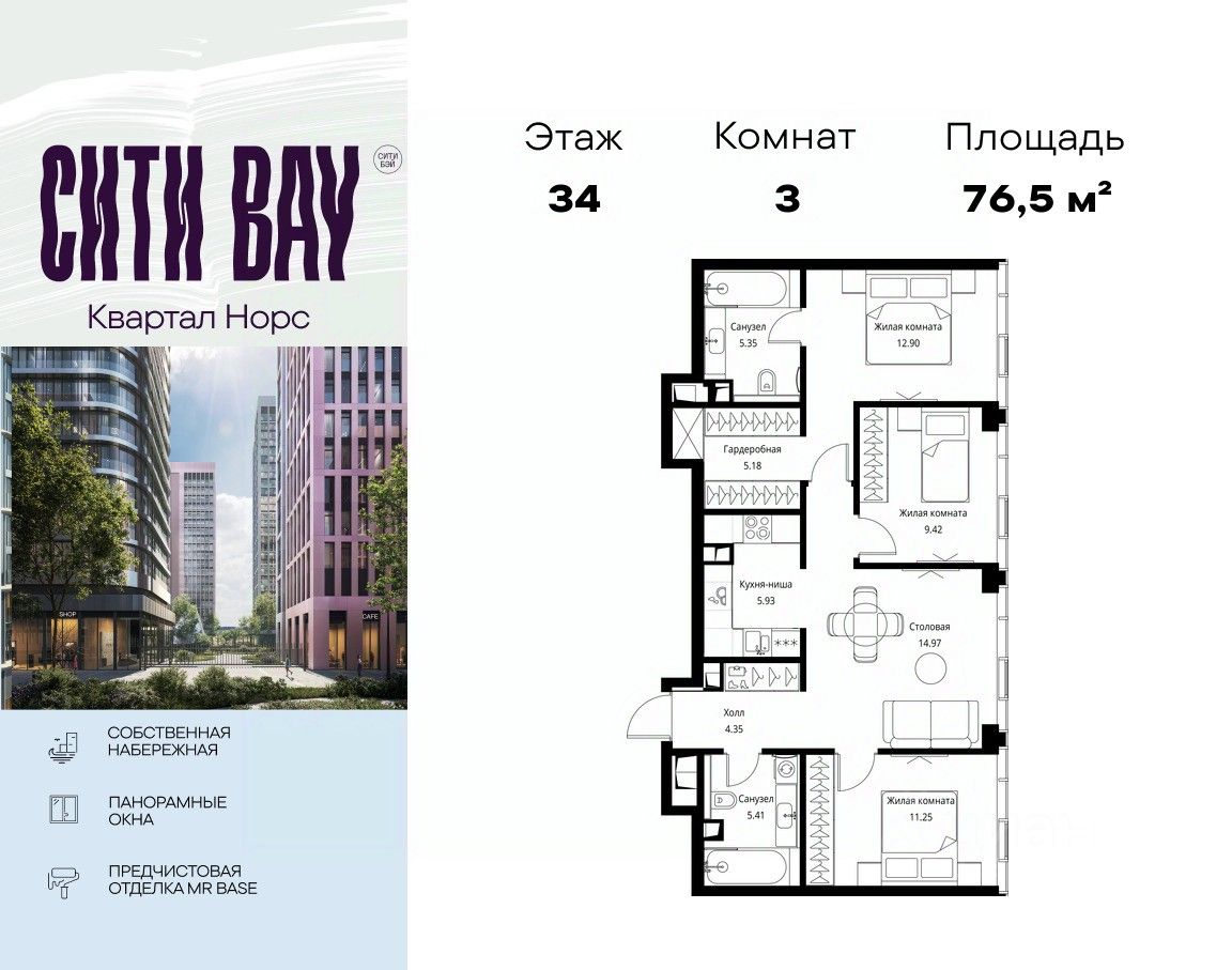 Продаётся 3-комнатная квартира общей площадью 76.49 м² с предчистовой отделкой в ЖК Сити Бэй, квартале Норс, на 34-м этаже 49 этажного дома.