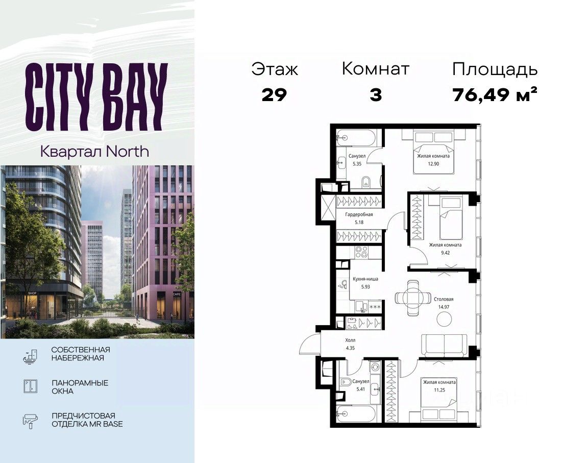 Продаётся 3-комнатная квартира общей площадью 76.49 м² с предчистовой отделкой в ЖК City Вау, квартале North, на 29-м этаже 49 этажного дома.