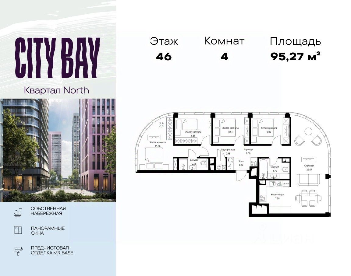 Продаётся 4-комнатная квартира общей площадью 95.27 м² с предчистовой отделкой в ЖК City Вау, квартале North, на 46-м этаже 49 этажного дома.