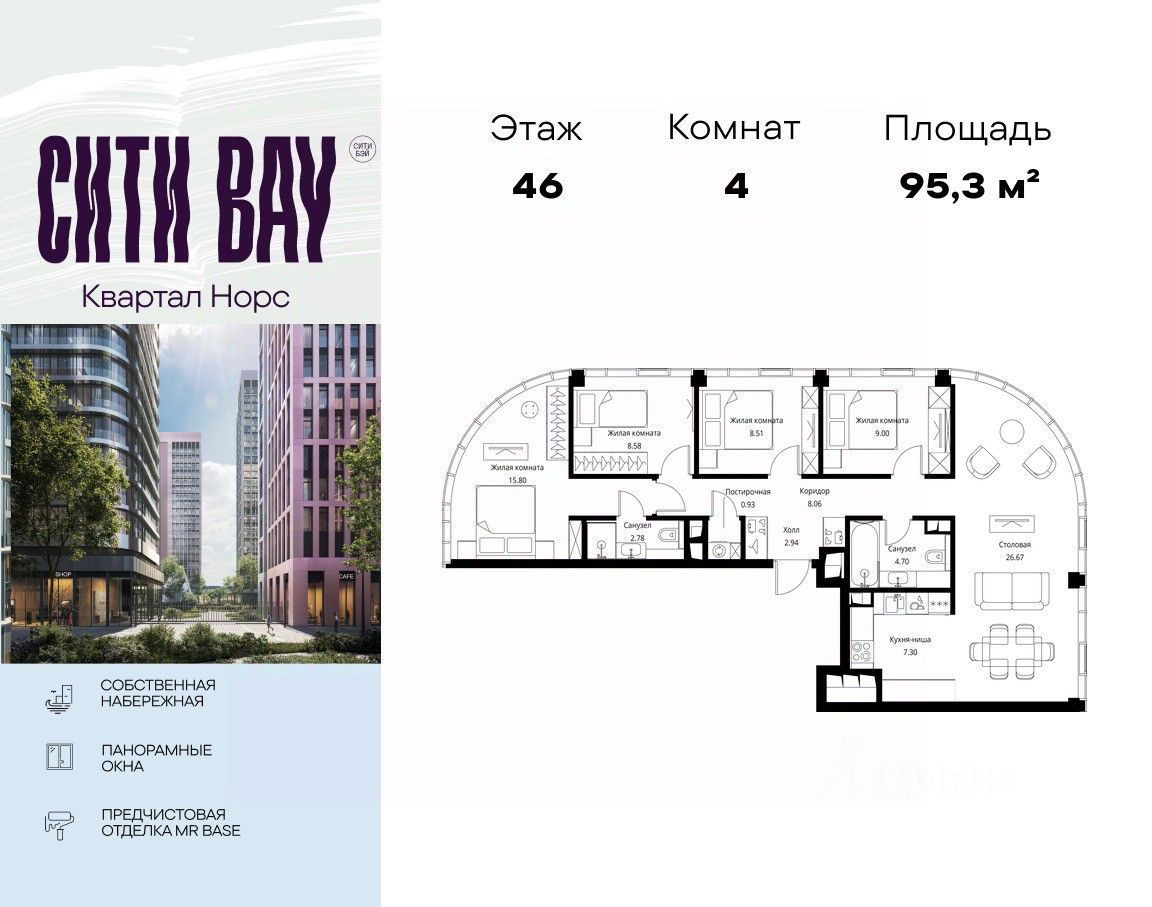 Продаётся 4-комнатная квартира общей площадью 95.27 м² с предчистовой отделкой в ЖК Сити Бэй, квартале Норс, на 46-м этаже 49 этажного дома.