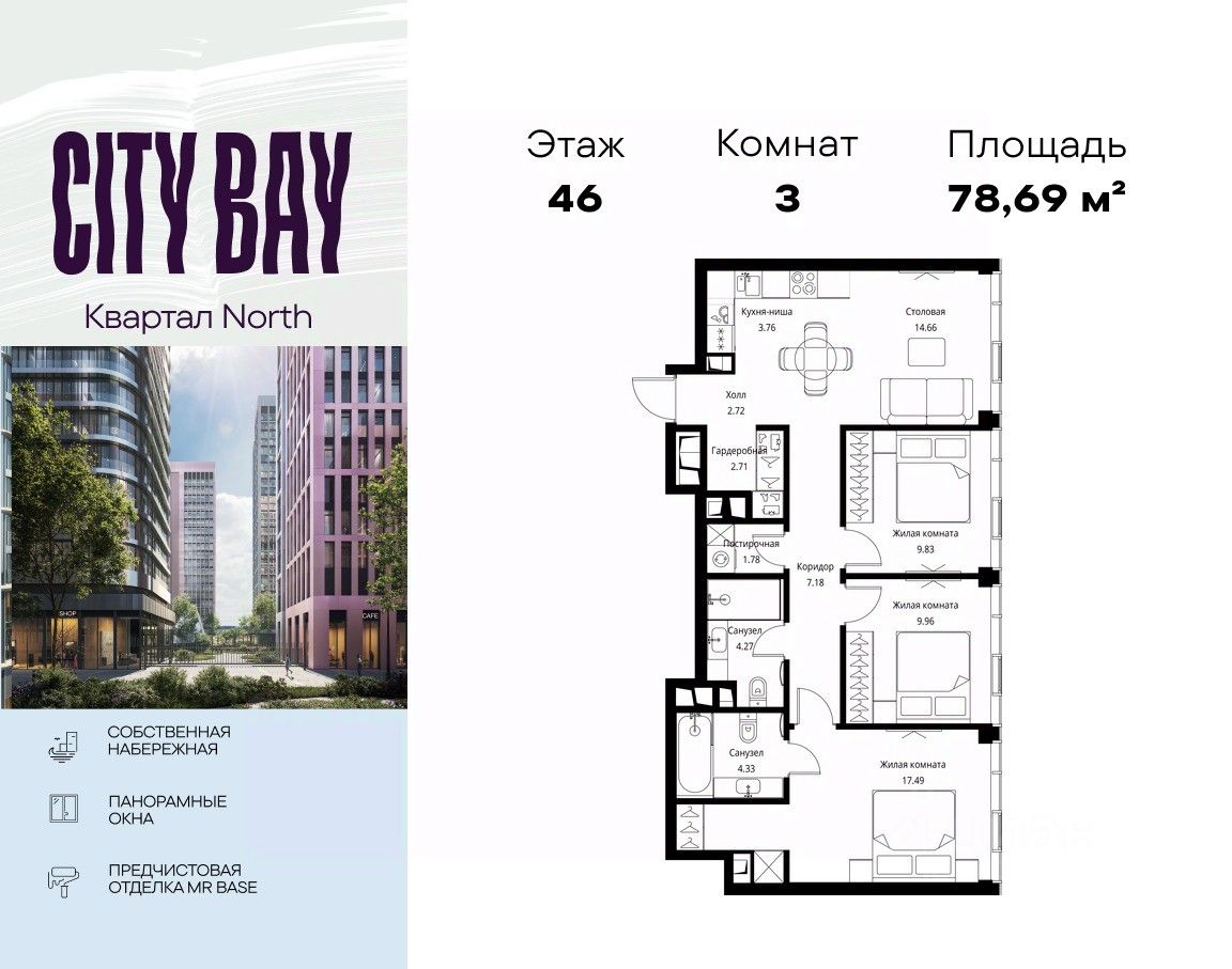 Продаётся 3-комнатная квартира общей площадью 78.69 м² с предчистовой отделкой в ЖК City Вау, квартале North, на 46-м этаже 49 этажного дома.