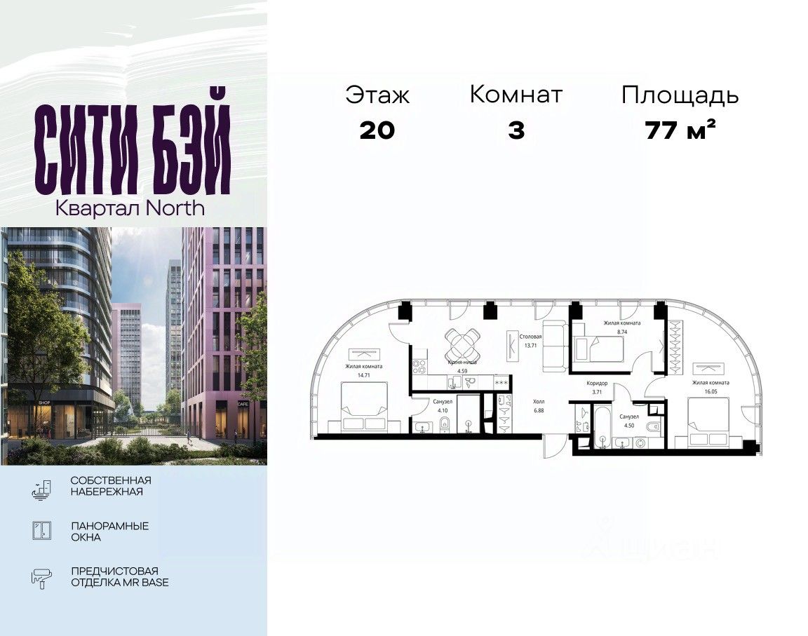 Продаётся 3-комнатная квартира общей площадью 76.98 м² с предчистовой отделкой в ЖК Сити Бэй, квартале Норс, на 20-м этаже 49 этажного дома.