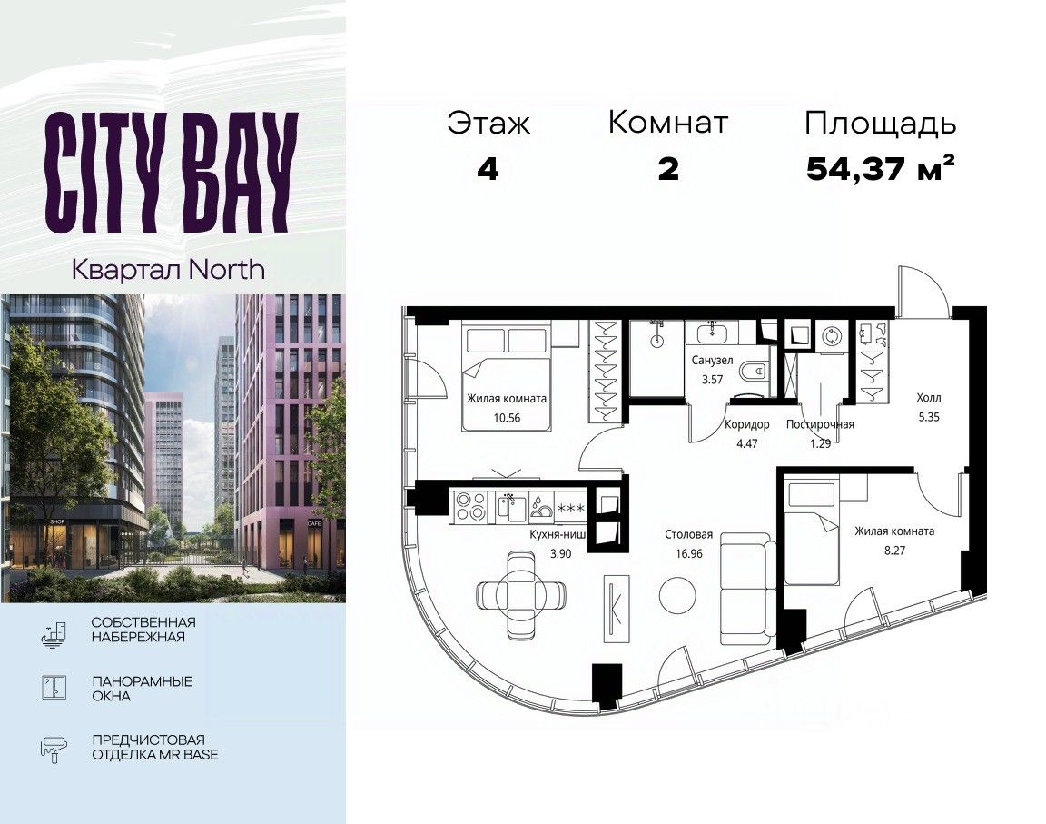 Продаётся 2-комнатная квартира общей площадью 54.37 м² с предчистовой отделкой в ЖК City Вау, квартале North, на 4-м этаже 49 этажного дома.