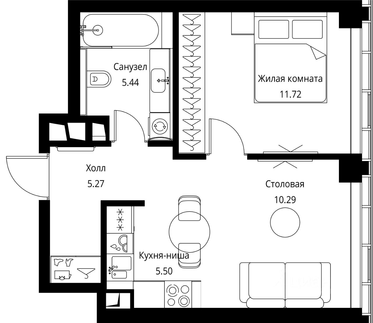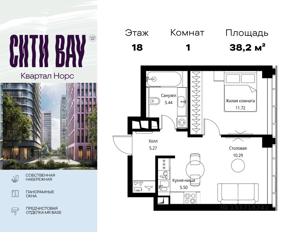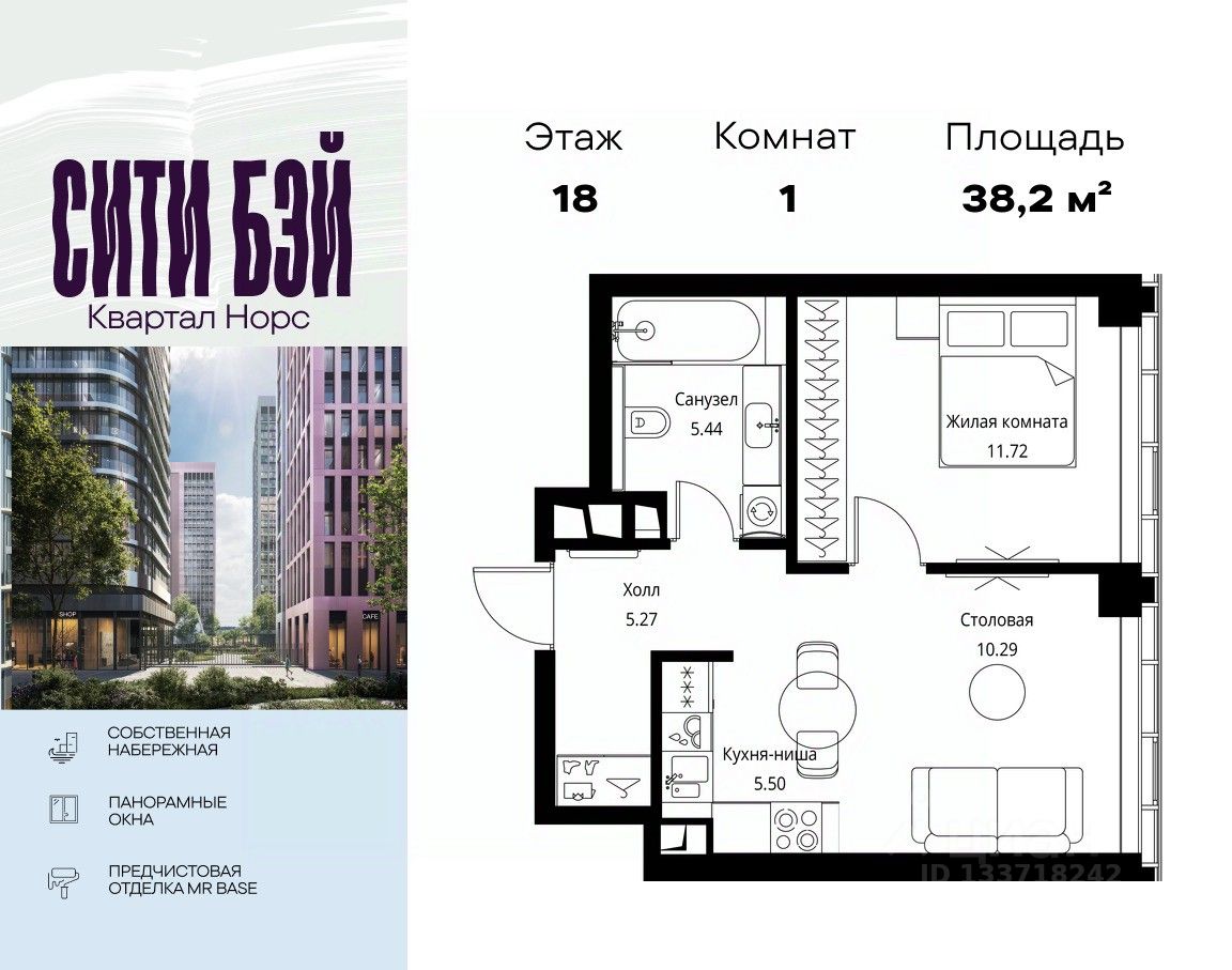 Продаётся 1-комнатная квартира общей площадью 38.22 м² с предчистовой отделкой в ЖК Сити Бэй, квартале Норс, на 18-м этаже 49 этажного дома.