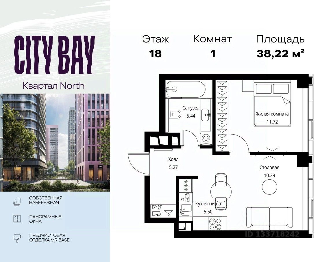 Продаётся 1-комнатная квартира общей площадью 38.22 м² с предчистовой отделкой в ЖК City Вау, квартале North, на 18-м этаже 49 этажного дома.