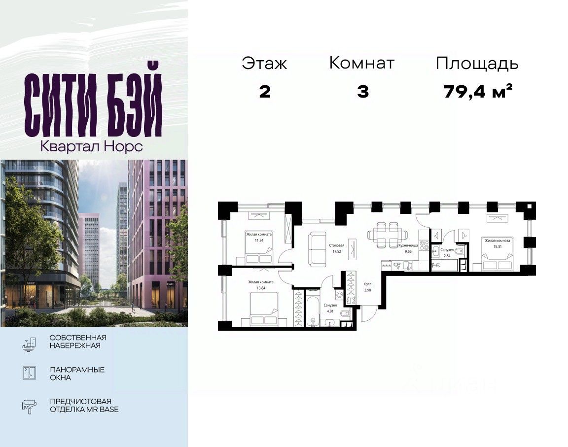 Продаётся 3-комнатная квартира общей площадью 79.40 м² с предчистовой отделкой в ЖК Сити Бэй, квартале Норс, на 2-м этаже 26 этажного дома.