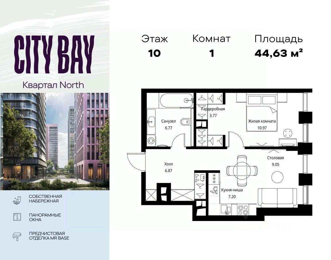 Продаётся 1-комнатная квартира общей площадью 44.63 м² с предчистовой отделкой в ЖК City Вау, квартале North, на 10-м этаже 26 этажного дома.