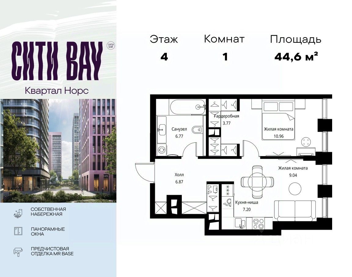 Продаётся 1-комнатная квартира общей площадью 44.61 м² с предчистовой отделкой в ЖК Сити Бэй, квартале Норс, на 4-м этаже 26 этажного дома.
