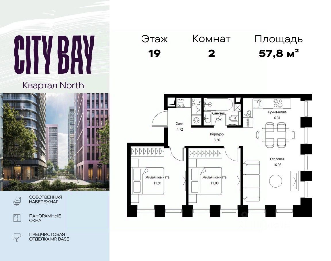 Продаётся 2-комнатная квартира общей площадью 57.80 м² с предчистовой отделкой в ЖК City Вау, квартале North, на 19-м этаже 26 этажного дома.