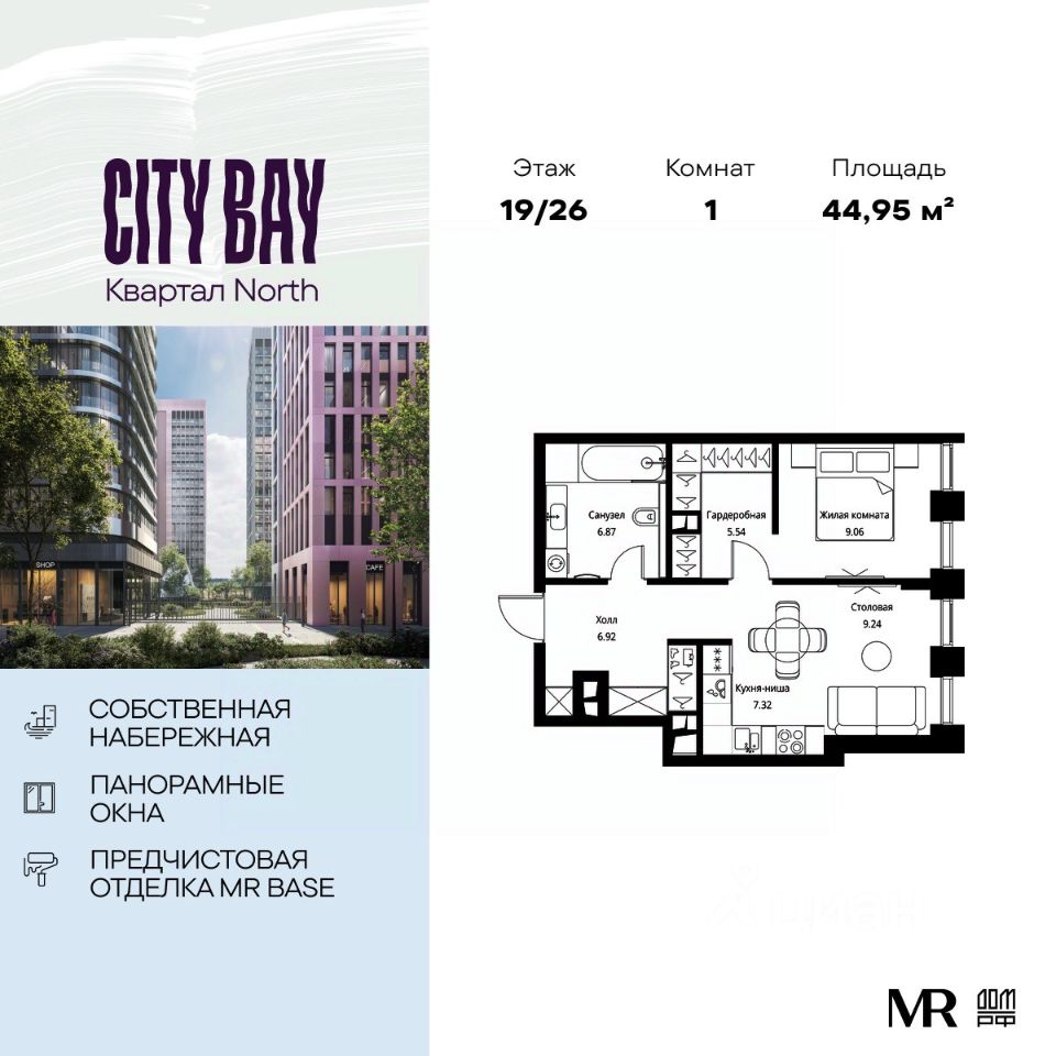Продаётся 1-комнатная квартира общей площадью 44.95 м² с предчистовой отделкой в ЖК City Вау, квартале North, на 19-м этаже 26 этажного дома.