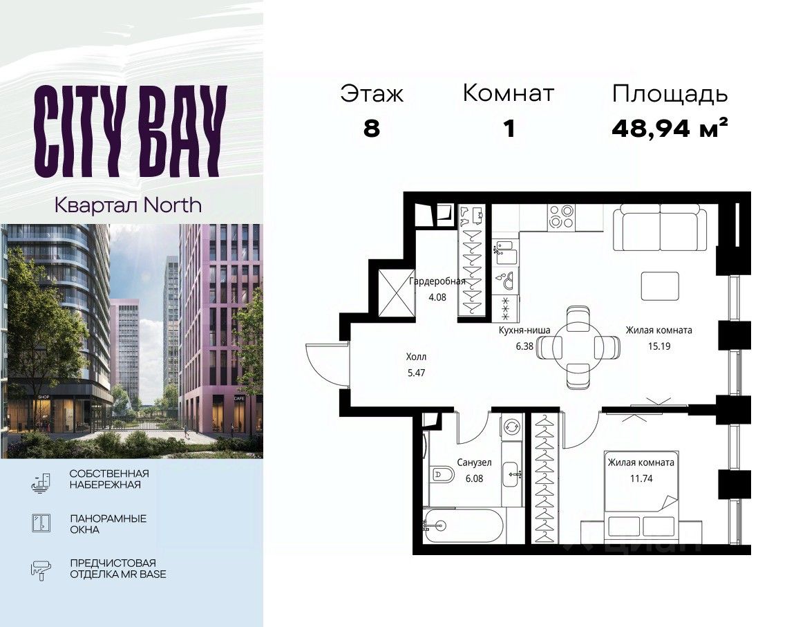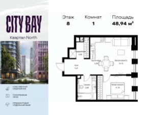 Продаётся 1-комнатная квартира общей площадью 48.94 м² с предчистовой отделкой в ЖК City Вау, квартале North, на 8-м этаже 26 этажного дома.
