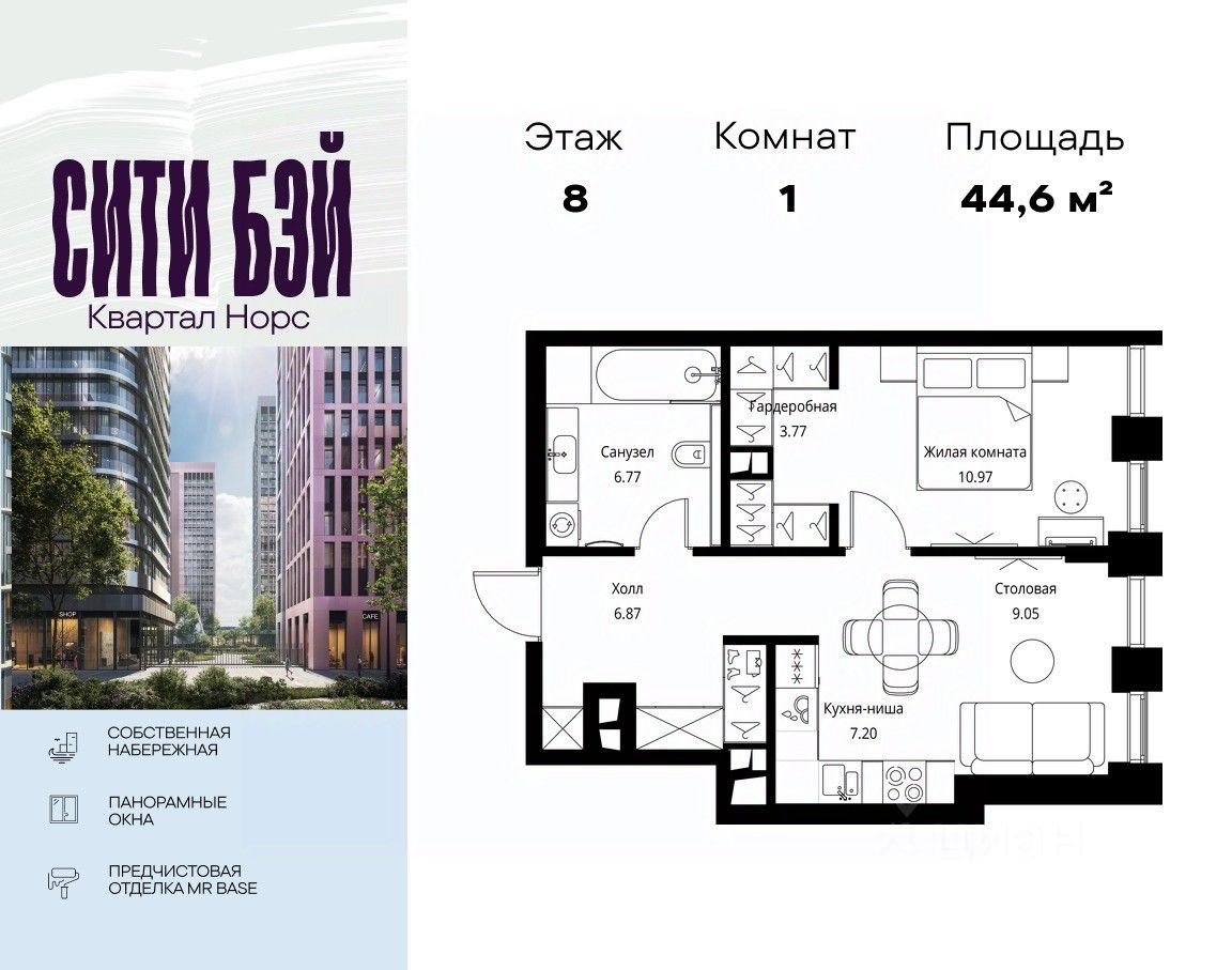 Продаётся 1-комнатная квартира общей площадью 44.63 м² с предчистовой отделкой в ЖК Сити Бэй, квартале Норс, на 8-м этаже 26 этажного дома.