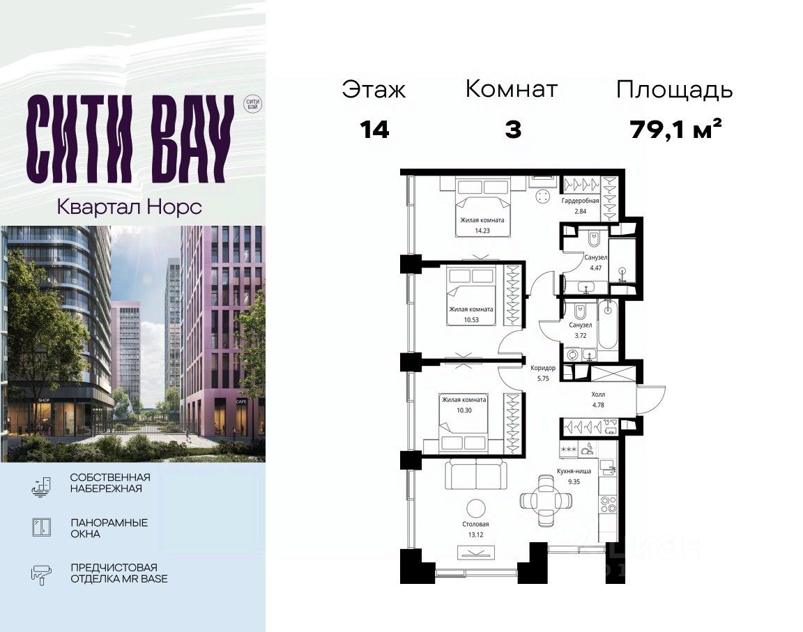 Продаётся 3-комнатная квартира общей площадью 79.09 м² с предчистовой отделкой в ЖК Сити Бэй, квартале Норс, на 14-м этаже 26 этажного дома.