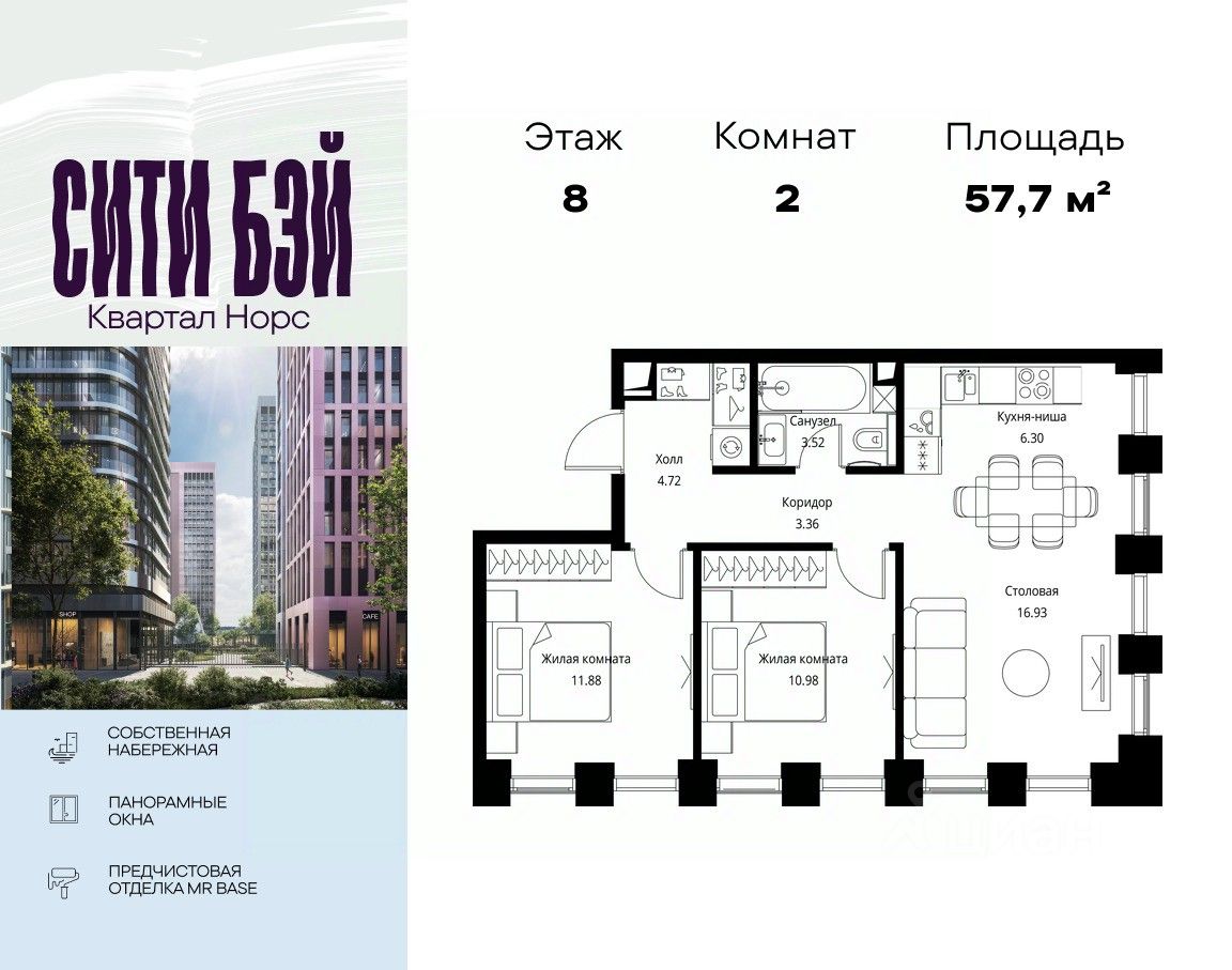 Продаётся 2-комнатная квартира общей площадью 57.69 м² с предчистовой отделкой в ЖК Сити Бэй, квартале Норс, на 8-м этаже 26 этажного дома.
