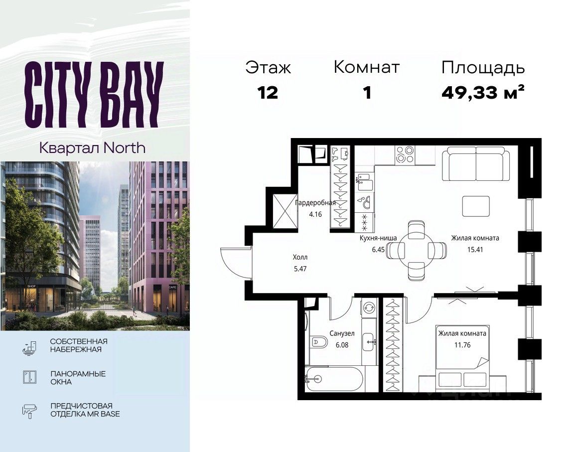 Продаётся 1-комнатная квартира общей площадью 49.33 м² с предчистовой отделкой в ЖК City Вау, квартале North, на 12-м этаже 26 этажного дома.