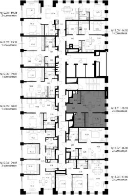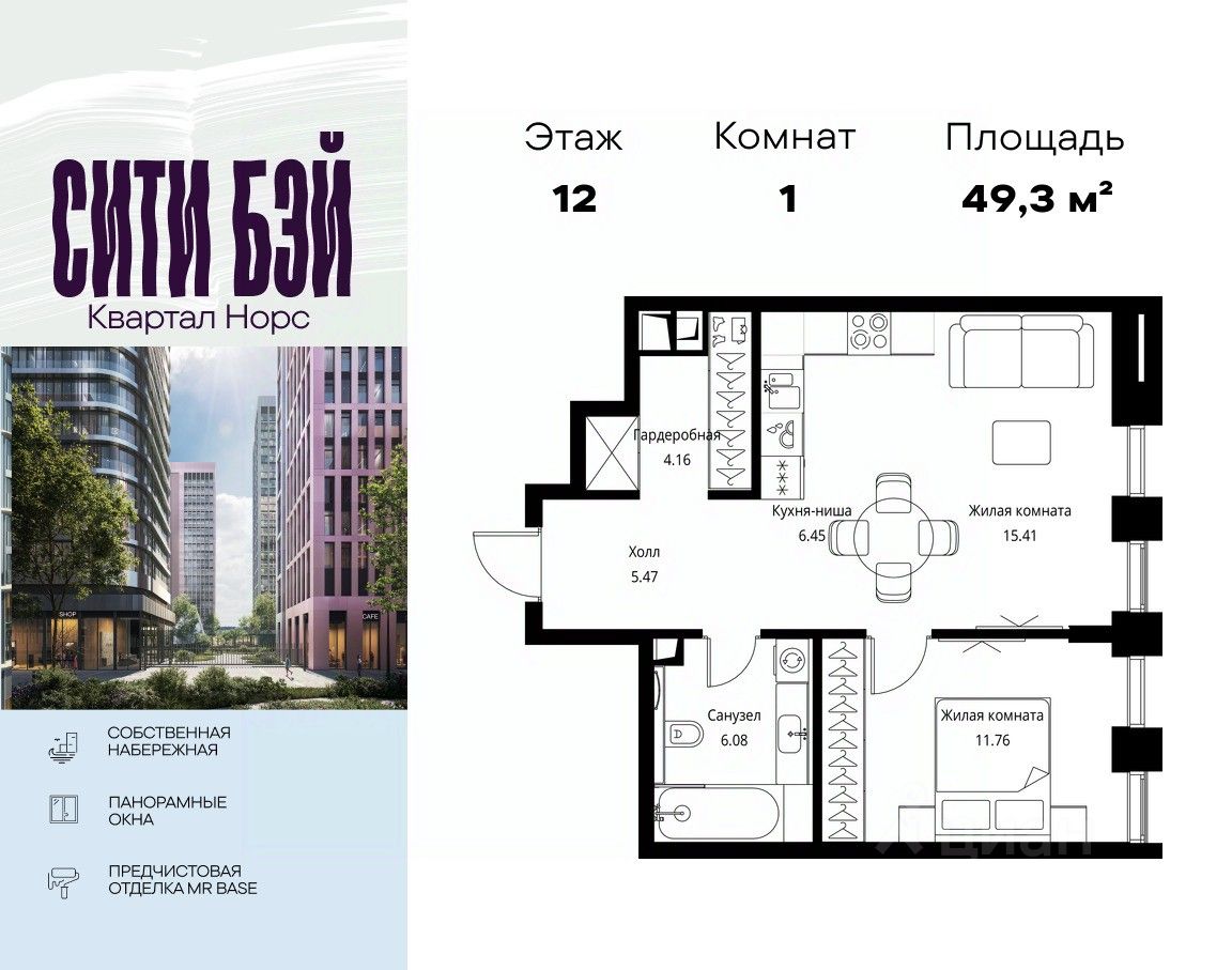 Продаётся 1-комнатная квартира общей площадью 49.33 м² с предчистовой отделкой в ЖК Сити Бэй, квартале Норс, на 12-м этаже 26 этажного дома.