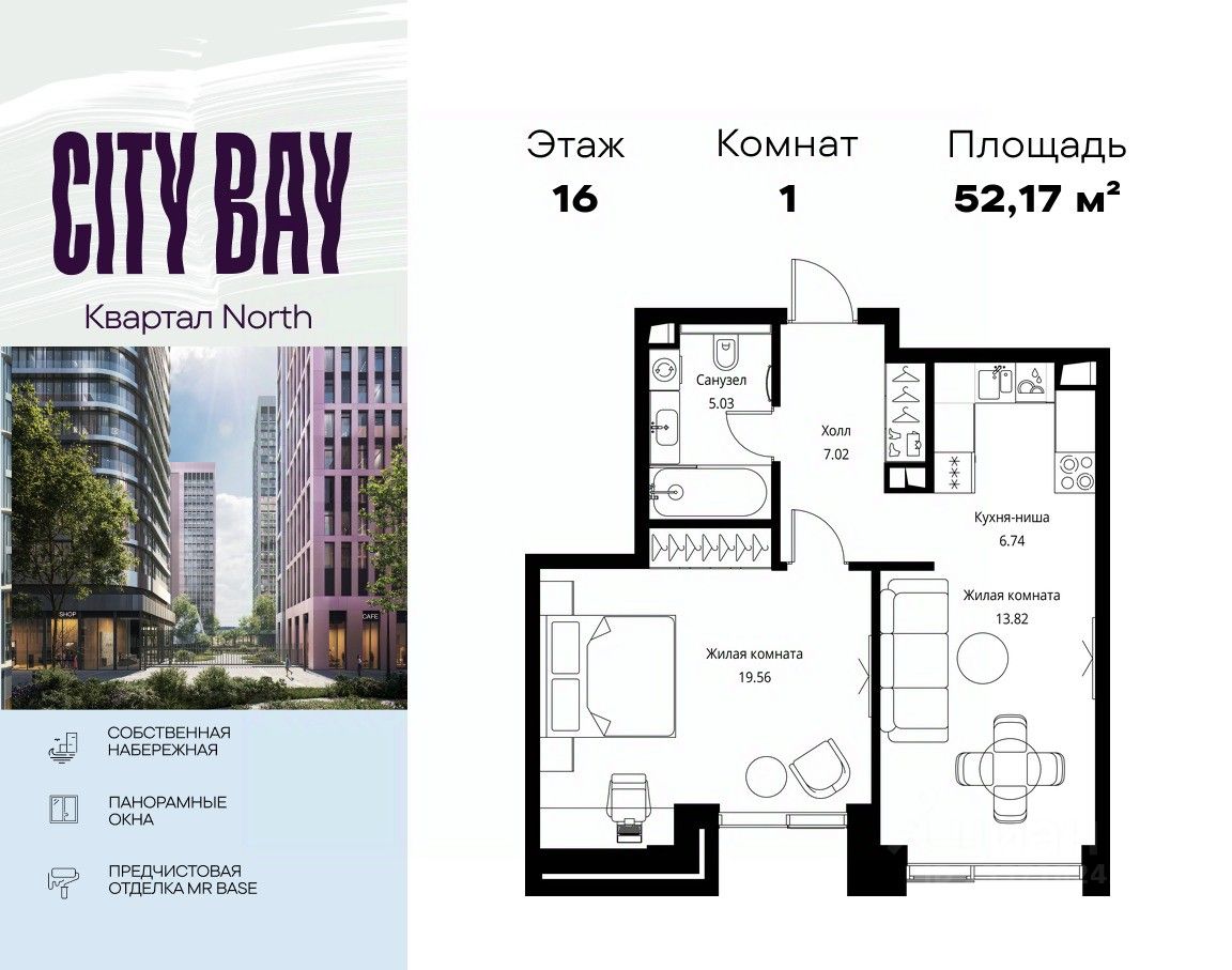Продаётся 1-комнатная квартира общей площадью 52.17 м² с предчистовой отделкой в ЖК City Вау, квартале North, на 16-м этаже 27 этажного дома.