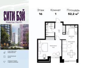 Продаётся 1-комнатная квартира общей площадью 52.17 м² с предчистовой отделкой в ЖК Сити Бэй, квартале Норс, на 16-м этаже 27 этажного дома.