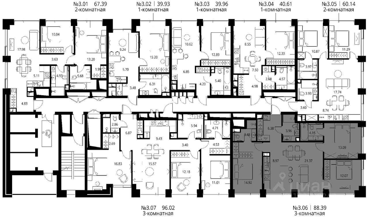 Продаётся 3-комнатная квартира общей площадью 88.39 м² с предчистовой отделкой в ЖК Сити Бэй, квартале Норс, на 3-м этаже 27 этажного дома.