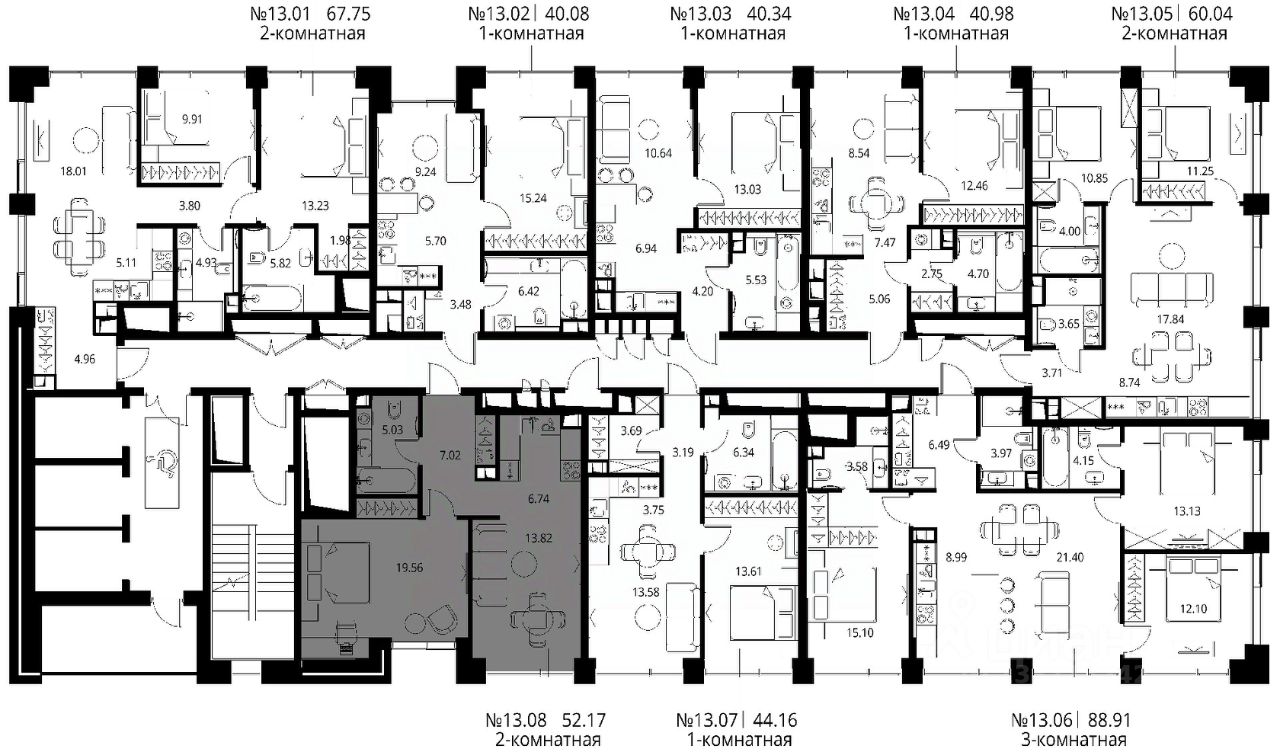 Продаётся 1-комнатная квартира общей площадью 52.17 м² с предчистовой отделкой в ЖК Сити Бэй, квартале Норс, на 13-м этаже 27 этажного дома.