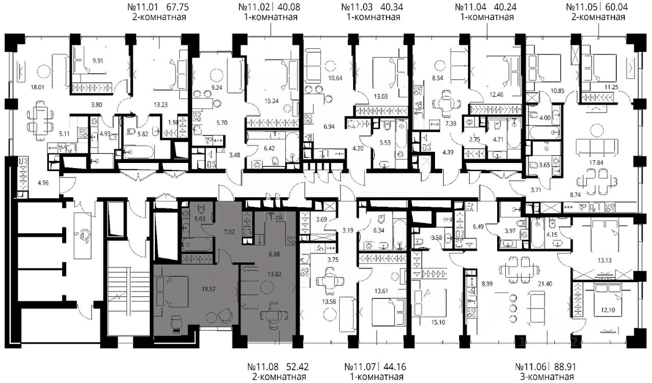 Продаётся 1-комнатная квартира общей площадью 52.42 м² с предчистовой отделкой в ЖК Сити Бэй, квартале Норс, на 11-м этаже 27 этажного дома.