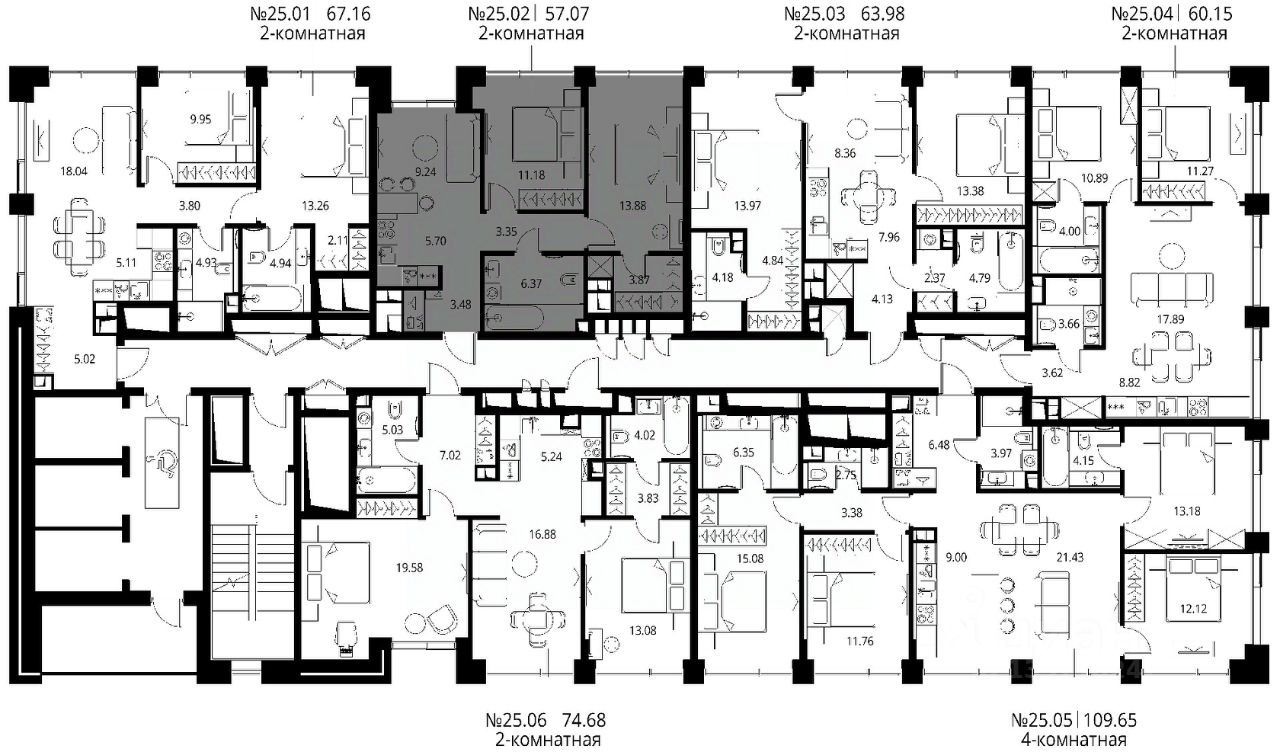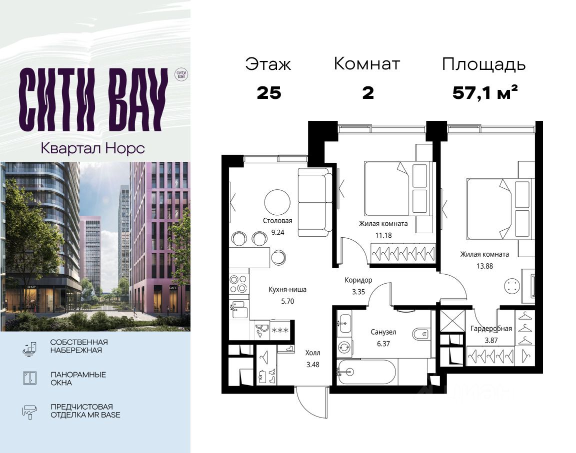Продаётся 2-комнатная квартира общей площадью 57.07 м² с предчистовой отделкой в ЖК Сити Бэй, квартале Норс, на 25-м этаже 27 этажного дома.
