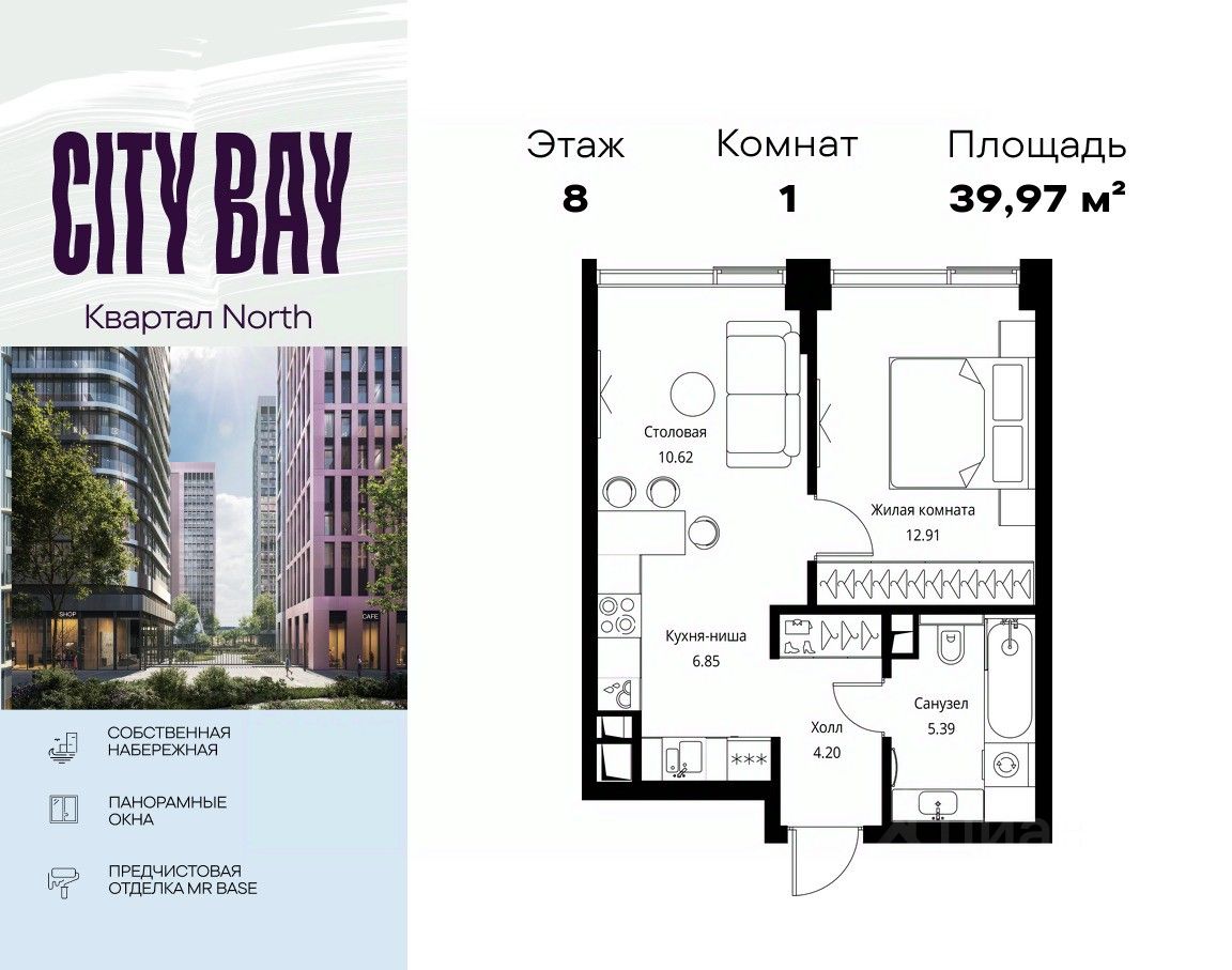 Продаётся 1-комнатная квартира общей площадью 39.97 м² с предчистовой отделкой в ЖК City Вау, квартале North, на 8-м этаже 27 этажного дома.