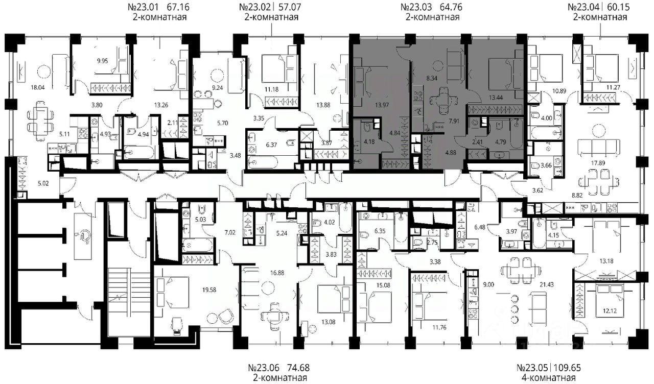 Продаётся 2-комнатная квартира общей площадью 64.76 м² с предчистовой отделкой в ЖК Сити Бэй, квартале Норс, на 23-м этаже 27 этажного дома.
