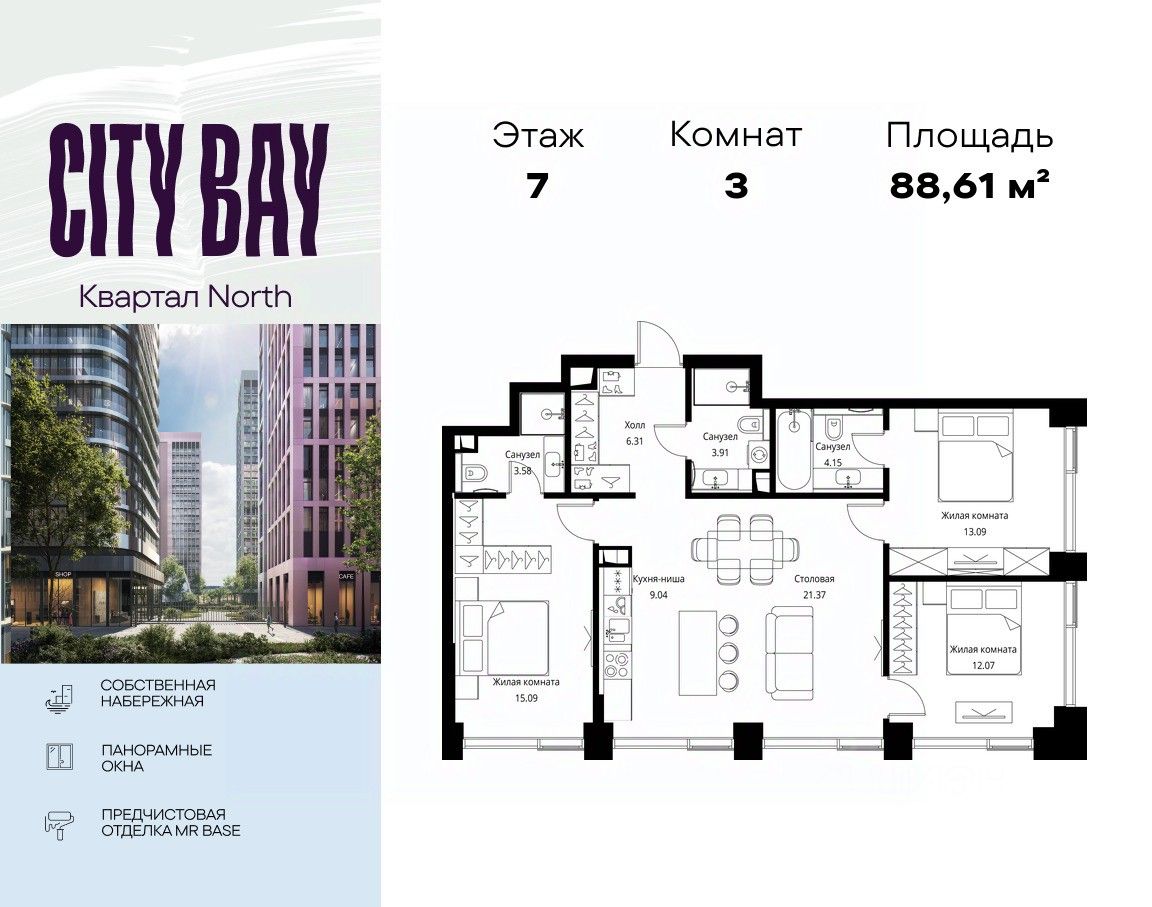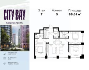 Продаётся 3-комнатная квартира общей площадью 88.61 м² с предчистовой отделкой в ЖК City Вау, квартале North, на 7-м этаже 27 этажного дома.