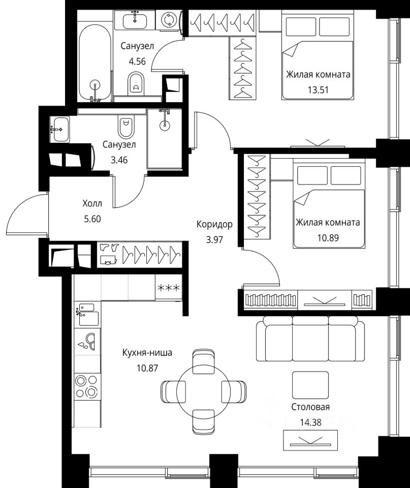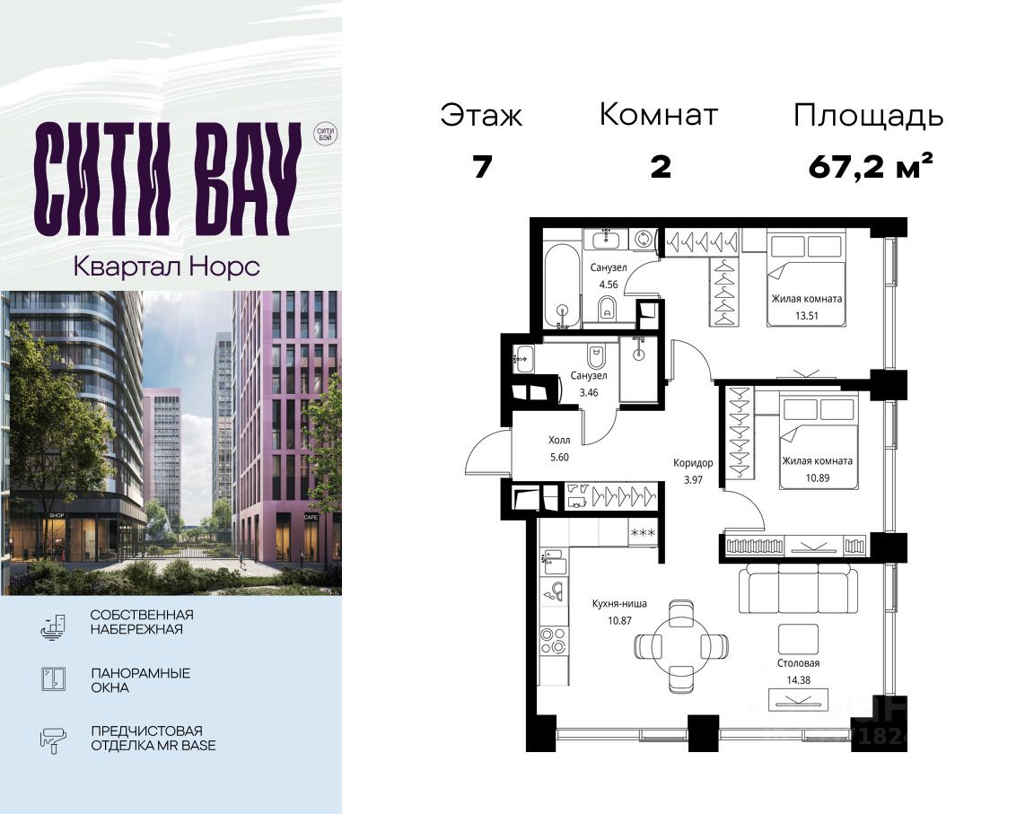 Продаётся 2-комнатная квартира общей площадью 67.24 м² с предчистовой отделкой в ЖК Сити Бэй, квартале Норс, на 7-м этаже 24 этажного дома.