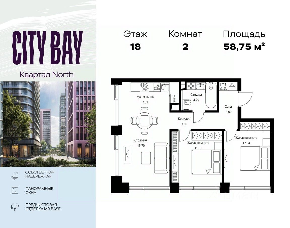 Продаётся 2-комнатная квартира общей площадью 58.75 м² с предчистовой отделкой в ЖК City Вау, квартале North, на 18-м этаже 24 этажного дома.